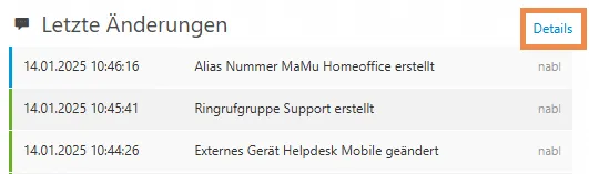 Im Cloud Control Panel können Sie jederzeit auf der rechten Seite die letzten Änderungen an Ihrer Telefonanlage einsehen.