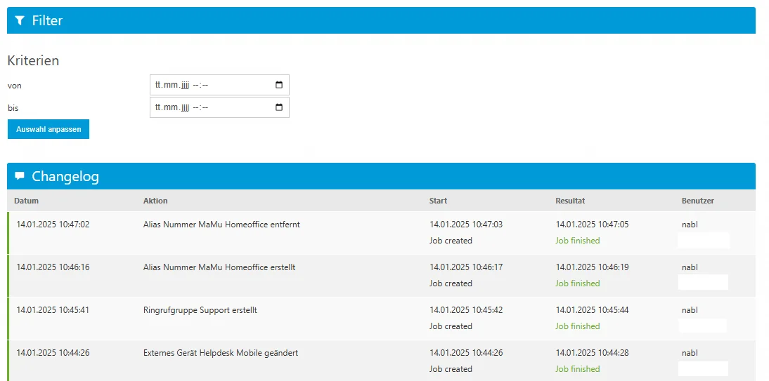 In CloudCall wird für jede Änderung ein Änderungsprotokoll (Changelog) erstellt, das den verantwortlichen Benutzer und die zugehörige IP-Adresse dokumentiert. Auf diese Weise bleiben alle Änderungen jederzeit transparent und nachvollziehbar.