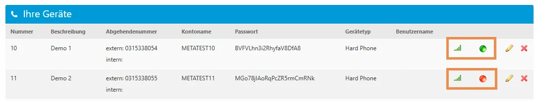 In der Geräteübersicht können Sie neben der Bearbeitung und dem Löschen von Geräten auch den SIP-Status und die Verfügbarkeit jedes Geräts einsehen.