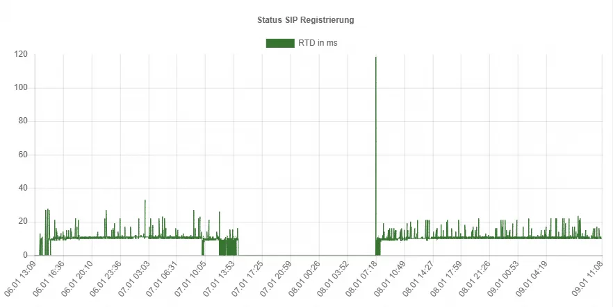 Ein Klick auf das Signal-Symbol öffnet ein Fenster, das die Verfügbarkeit des Geräts der letzten 3 Tage grafisch darstellt. Zusätzlich werden Zeiträume ohne Registrierung sowie die in diesem Zeitraum genutzten IP-Adressen angezeigt.