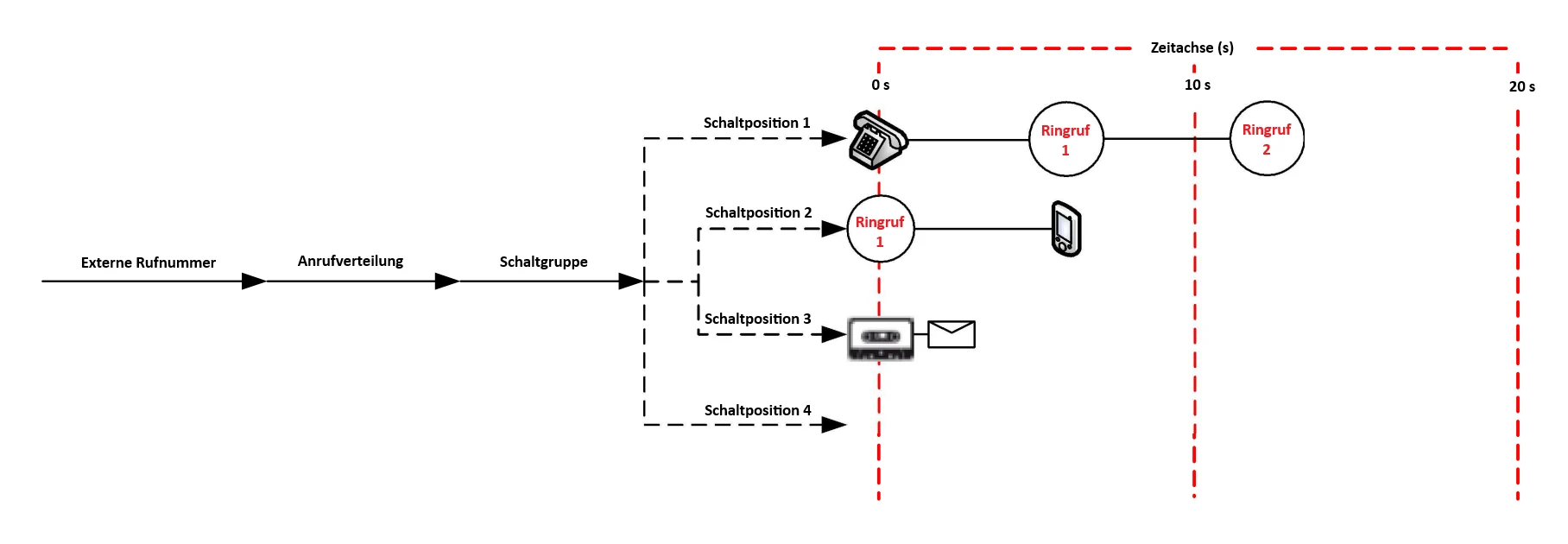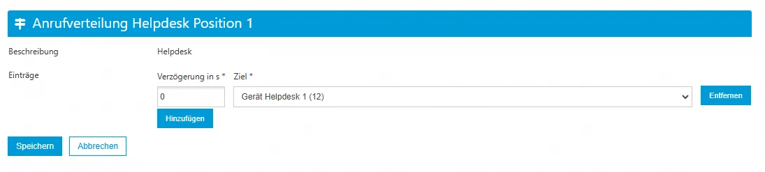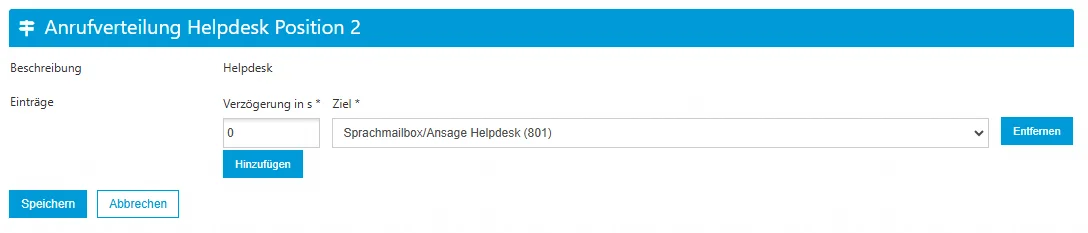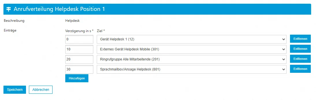 - Nach weiteren 10 Sekunden (30 Sekunden): Bleibt der Anruf unbeantwortet, wird er an die Sprachmailbox/Ansage Helpdesk weitergeleitet.