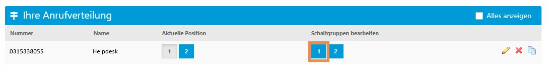 Nachdem Sie einer Anrufverteilung eine Schaltgruppe zugewiesen haben, können Sie diese über die Übersichtsseite der Anrufverteilungen verwalten. Dort können Sie die Position manuell umschalten und die Schaltpositionen nach Bedarf konfigurieren.