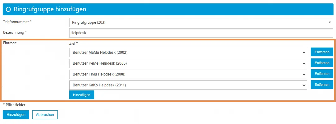 Im Beispiel: In der Ringrufgruppe wurden die Benutzer als Ziele hinzugefügt, die die Helpdesk-Anrufe entgegennehmen sollen.