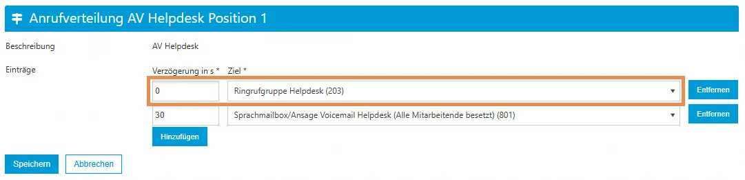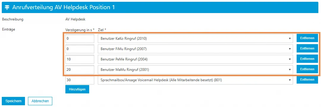 In dieser Variante werden die Benutzer direkt in der Schaltposition als Ziele konfiguriert, wobei das Anrufprofil "Ringruf" verwendet wird. Der Vorteil dieser Methode besteht darin, dass Sie die einzelnen Benutzer direkt in der Anrufverteilung bearbeiten und bei Bedarf eine Zeitverzögerung zwischen den Weiterleitungen einfügen können.