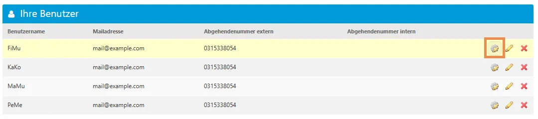 - Klicken Sie beim gewünschten Benutzer auf das Zahnrad-Bleistift-Symbol, um die Anrufprofile zu bearbeiten.