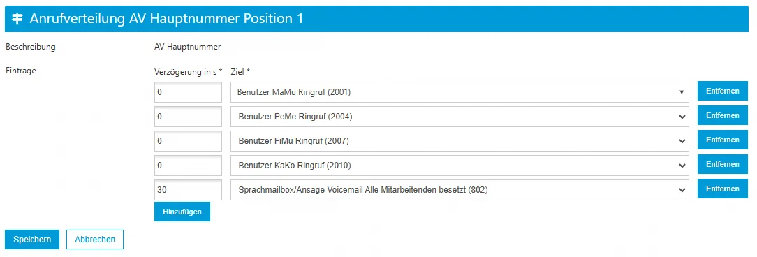 Beispiel: In der Anrufverteilung "AV Hauptnummer" ist die Schaltposition so konfiguriert, dass eingehende Anrufe gleichzeitig an vier Benutzer weitergeleitet werden. Als Ziele wurden die Anrufprofile "Ringruf" der Benutzer MaMu, PeMe, FiMu und KaKo hinzugefügt.