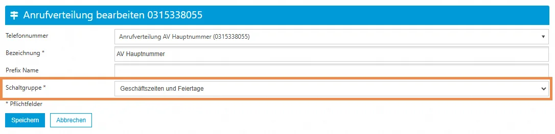 Nachdem Sie die Schaltgruppe erstellt haben, weisen Sie diese der Anrufverteilung zu, um die Steuerung basierend auf den Zeitplänen zu aktivieren.