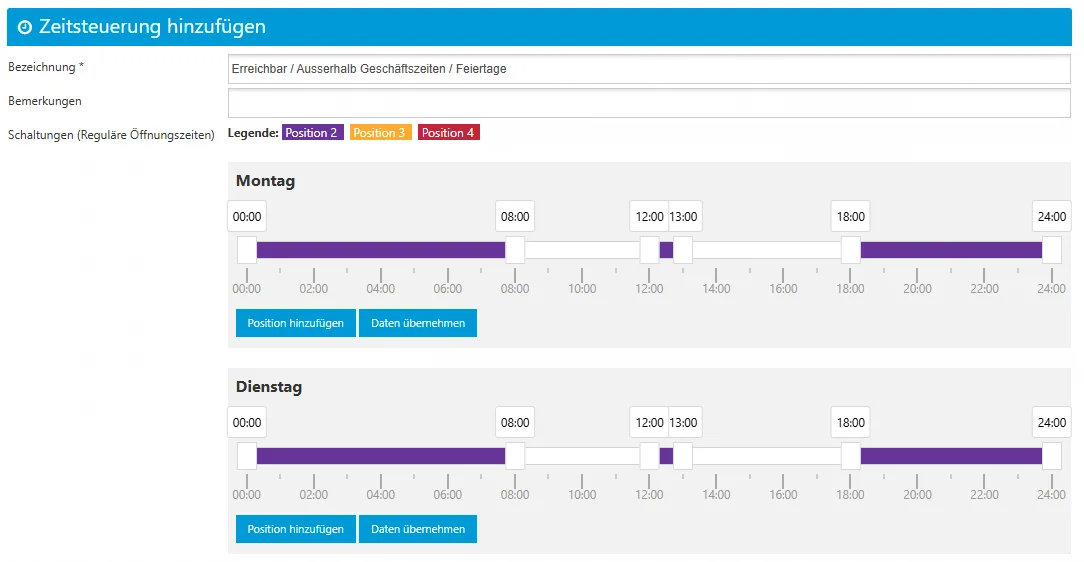 - Schaltpositionen (1-4): Geben Sie die benötigte Anzahl an Schaltpositionen ein. In diesem Beispiel sind es 3 (1 = Erreichbar, 2 = Ausserhalb Geschäftszeiten, 3 = Feiertage).
