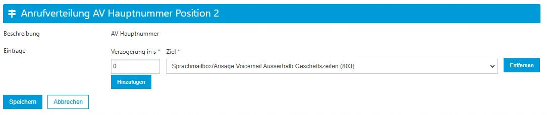 - Erstes Ziel: Der Anruf wird direkt an die Voicemail "Ausserhalb Geschäftszeiten" weitergeleitet.