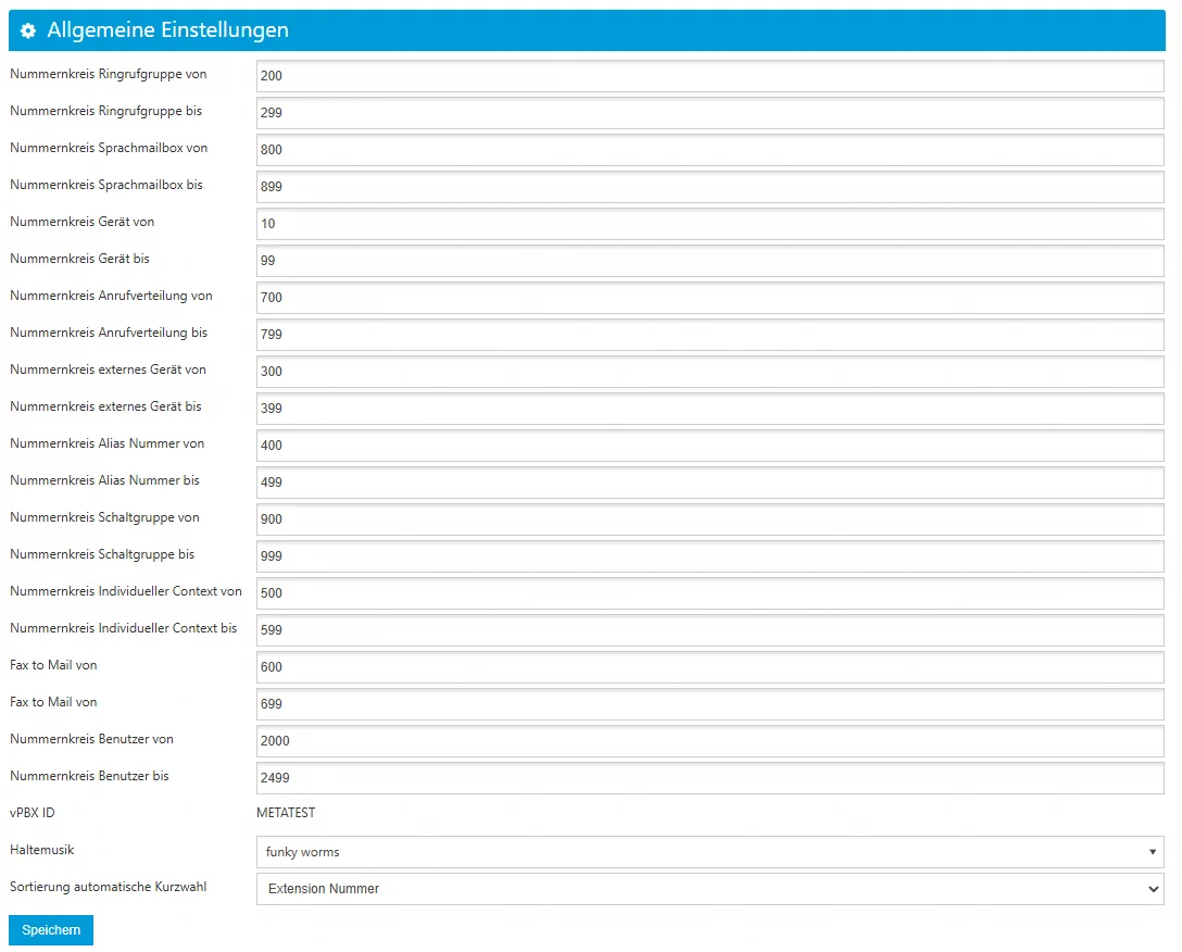 In den allgemeinen Einstellungen können Sie die Haltemusik festlegen, die vPBX-ID einsehen und die Reihenfolge der automatischen Kurzwahl definieren. Ausserdem haben Sie die Möglichkeit, Nummernkreise für Ihre Objekte zu konfigurieren. Nummernkreise sind festgelegte Rufnummernbereiche, die für die interne Kommunikation in der Telefonanlage genutzt werden.