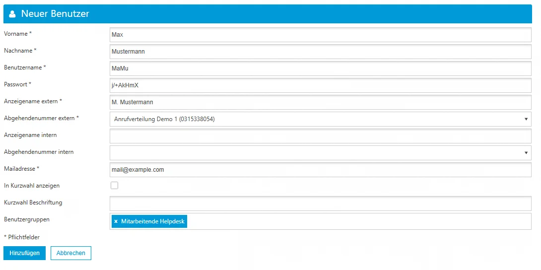 - Füllen Sie die erforderlichen Felder aus und klicken Sie auf "Hinzufügen", um den neuen Benutzer zu speichern.