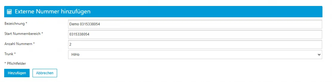 - Klicken Sie auf die Schaltfläche "Neue externe Nummer", um eine neue Nummer oder einen Nummernbereich hinzuzufügen.