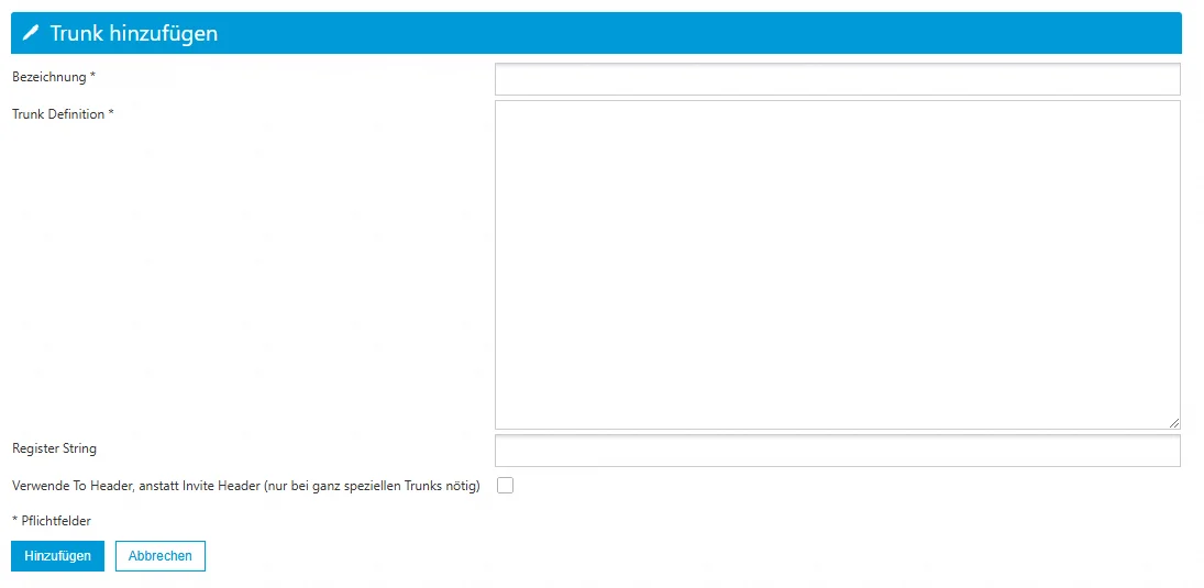 - Füllen Sie alle erforderlichen Felder aus und klicken Sie auf "Hinzufügen", um den Trunk zu speichern.